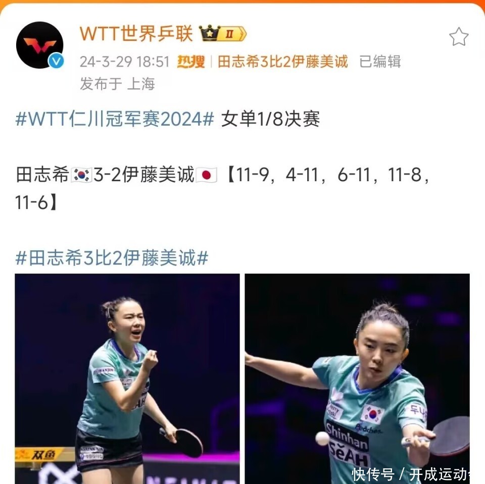 (二)另一场WTT仁川冠军赛女单1/8决赛,田志希以3-2的比分治服日乒伊藤好意思诚。赛后,田志希哭了,这是收效的昌盛,亦然喜极而泣!下一轮,田志希的敌手泪,她将对阵王曼昱vs郑怡静的胜者。伊藤好意思诚无缘WTT仁川冠军赛女单八强。